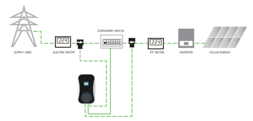The charging current is adjusted based on the amount of energy detected on the solar panels and into the grid.